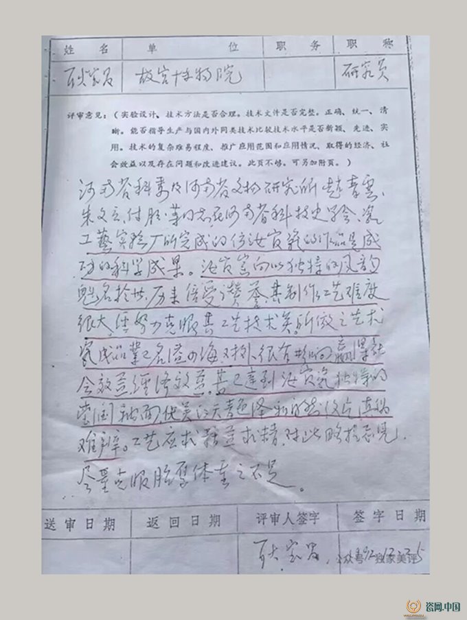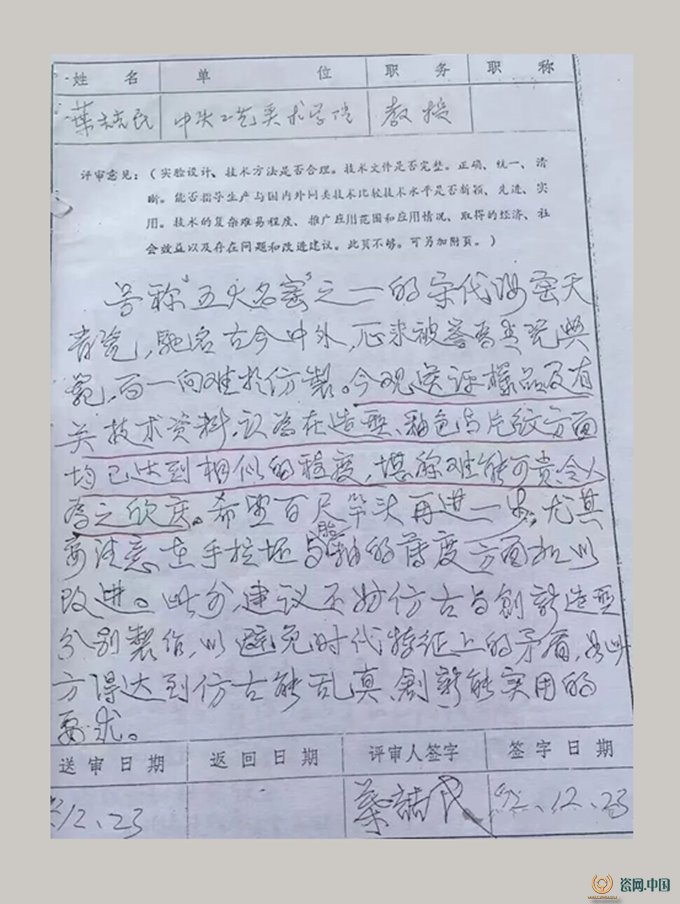 “号称‘五大名窑’之一的宋代汝窑天青瓷,驰名中外,后来被誉为青瓷典范,而一向难以仿制。今观送评样品及有关技术资料,认为在造型、釉色及片纹方面,均已达到相似的程度,堪称难能可贵,令人为之欣庆。”